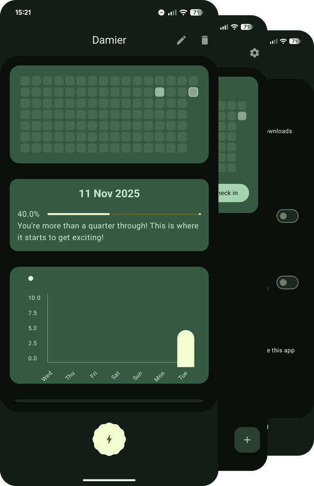 Damier is an Android habit tracker, with a Material 3 Expressive design. It is currently in development.